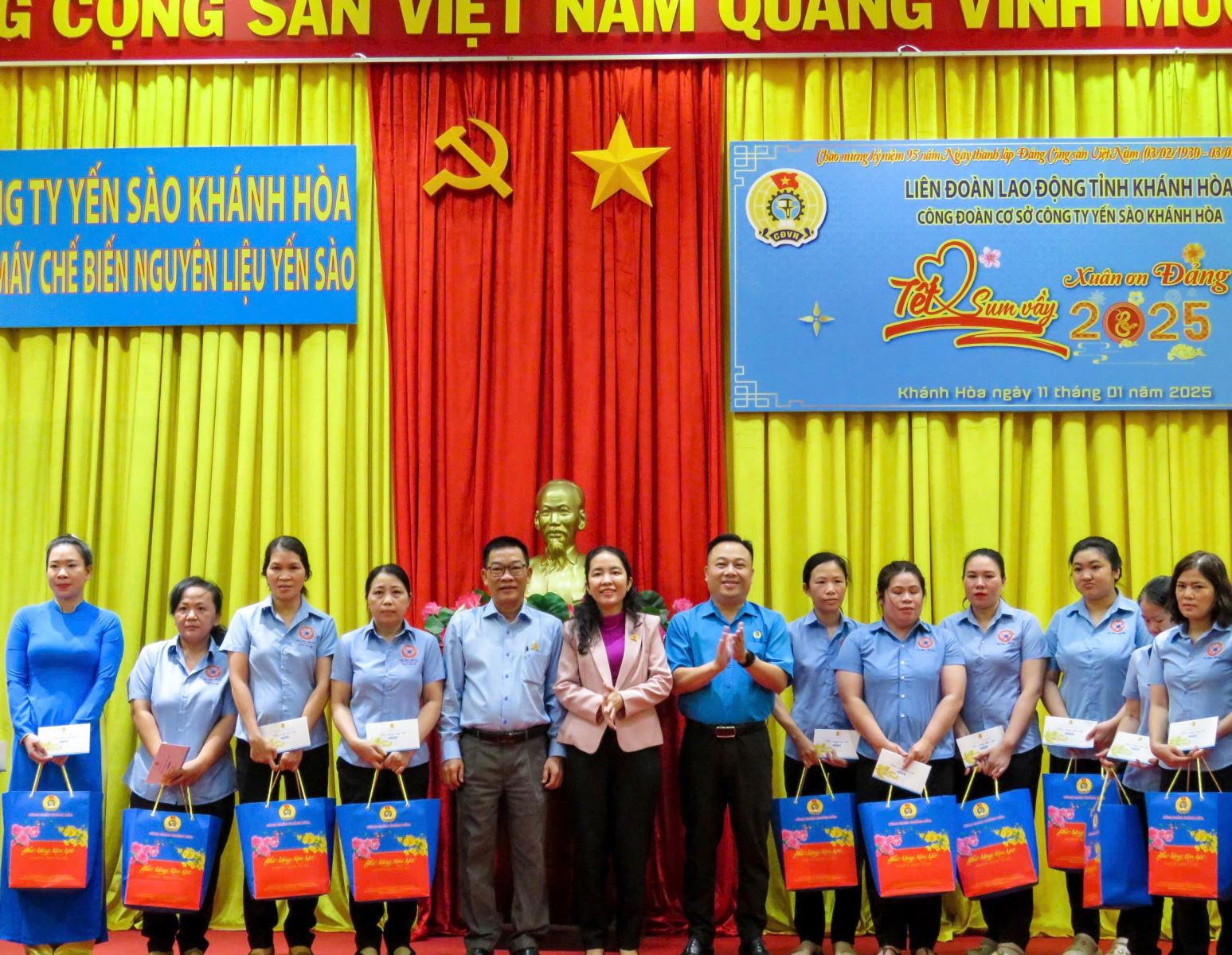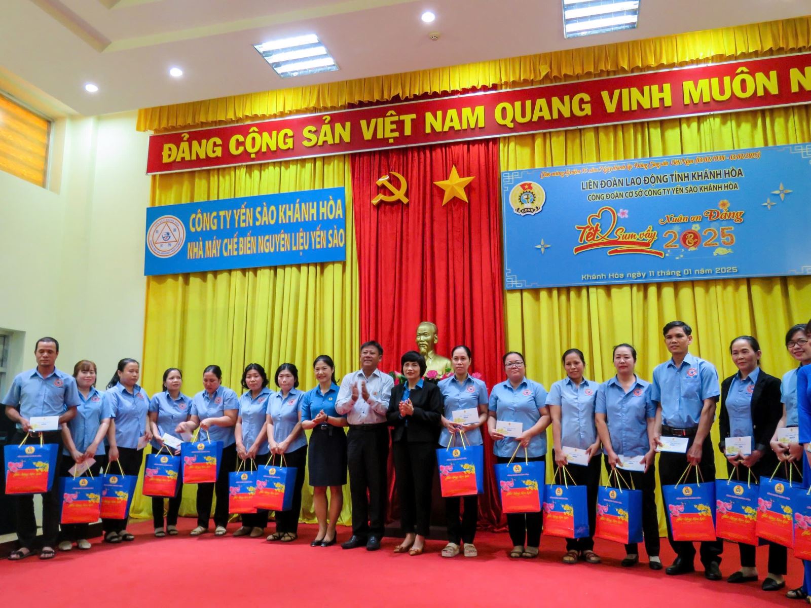 Sáng ngày 11/01/2025, Liên đoàn lao động tỉnh Khánh Hòa tổ chức chương trình “Tết Sum vầy – Xuân ơn Đảng năm 2025” tại Công đoàn bộ phận Nhà máy Chế biến Nguyên liệu Yến sào, trực thuộc Công đoàn Cơ sở Công ty Yến sào Khánh Hòa. Tham dự chương trình có đồng chí Trần Thị Hương - Phó Chủ tịch LĐLĐ tỉnh Đ/c Nguyễn Đức Trí - Phó Chủ tịch Liên đoàn lao động tỉnh, và các đồng chí trong Ban Thường vụ đoàn Cơ sở Công ty Yến sào Khánh Hòa, ban lãnh đạo Nhà máy. Tại chương trình, Liên đoàn lao động tỉnh Khánh Hòa tặng quà cho 45 đoàn viên công đoàn có hoàn cảnh khó khăn của Công đoàn bộ phận Nhà máy Chế biến Nguyên liệu Yến sào và Công đoàn bộ phận Nhà máy Thực phẩm Cao cấp Sanest Foods, trực thuộc Công đoàn Cơ sở Công ty Yến sào Khánh Hòa. Trị giá 1 triệu đồng/suất (gồm 700 nghìn đồng tiền mặt và túi quà trị giá 300 nghìn đồng).