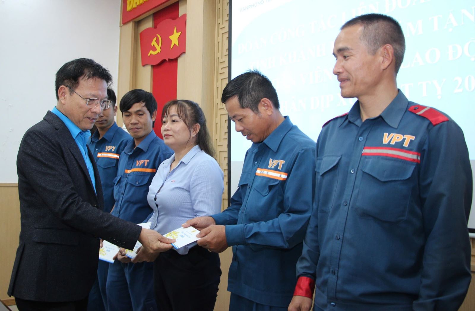 Ông Phan Thanh Liêm - Chủ tịch Liên đoàn Lao động tỉnh trao hỗ trợ cho đoàn viên, người lao động Công ty TNHH Liên doanh Kho Ngoại quan xăng dầu Vân Phong.