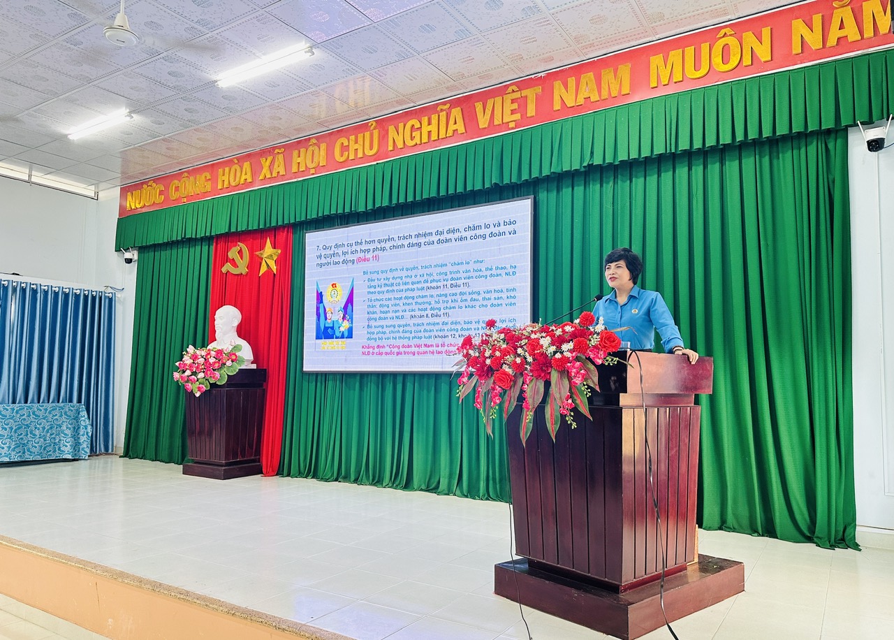 Tại hội nghị, đồng chí Trần Thị Hương – Phó Chủ tịch Liên đoàn Lao động tỉnh Khánh Hoà truyền đạt những nội dung cơ bản, điểm mới quan trọng liên quan đến đoàn viên, người lao động của Luật Công đoàn và Luật Bảo hiểm xã hội 2024.