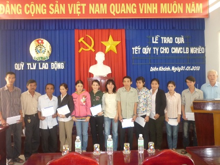 ■ Liên đoàn Lao động huyện Diên Khánh vừa tổ chức buổi gặp mặt và trao quà cho công nhân lao động có hoàn cảnh khó khăn nhân dịp Xuân Quý Tỵ năm 2013. Đồng chí Nguyễn Thắng Thâu - Uỷ viên Ban Thường vụ - Chủ tịch Công đoàn giáo dục huyện đã thăm hỏi, chúc tết và trao 15 suất quà với tổng giái trị 4.500.000 đồng cho CNVCLĐ. Tuy trị giá phần quà không lớn nhưng thể hiện được sự quan tâm sâu sắc của tổ chức công đoàn, của Quỹ Tấm Lòng vàng – Báo Lao động đối với người lao động.