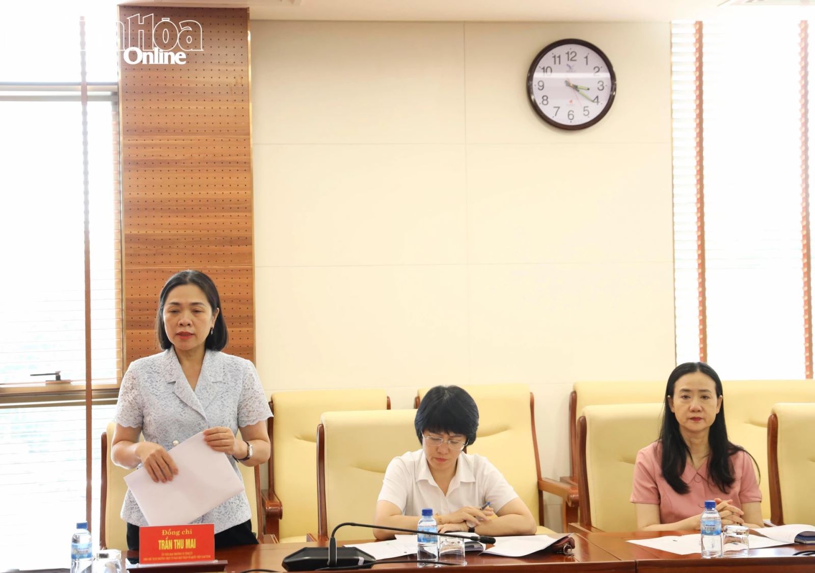 Đồng chí Trần Thu Mai góp ý tại cuộc họp.