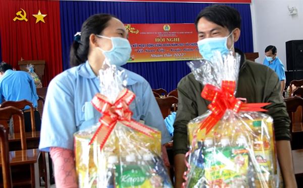 Nhân dịp này, Công đoàn các KCN trao hỗ trợ 40 suất quà Tết từ LĐLĐ tỉnh, mỗi suất trị giá 500.000 đồng và 200 suất quà mỗi suất trị giá 300.000 đồng cho CNLĐ có hoàn cảnh đặc biệt khó khăn, CNLĐ không có điều kiện về quê đón Tết, CNLĐ bị ảnh hưởng bởi dịch bệnh Covid-19.