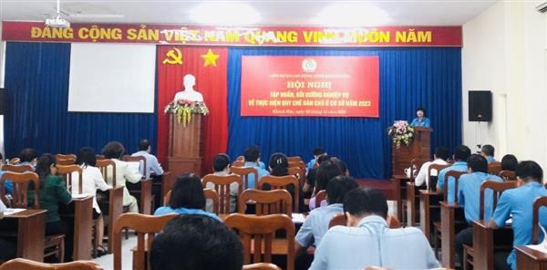 Tại hội nghị, Báo cáo viên Liên đoàn Lao động tỉnh đã truyền đạt các nội dung cơ bản của Luật thực hiện dân chủ ở cơ sở; Nghị định số 59/2023/NĐ-CP ngày 14/8/2023 của Chính phủ quy định chi tiết một số điều của luật thực hiện dân chủ ở cơ sở; Nghị định số 145 ngày 14-12-2022 của Chính phủ quy định chi tiết và hướng dẫn thi hành một số điều của Bộ Luật lao động về điều kiện lao động và quan hệ lao động, Chỉ thị số 07-CT/TU ngày 20/3/2017 của Tỉnh ủy Khánh Hòa về tăng cường sự lãnh đạo của Đảng trong việc thực hiện Quy chế dân chủ ở cơ quan, đơn vị, doanh nghiệp; triển khai Hướng dẫn số 90/HD-TLĐ ngày 17/7/2023 của Tổng Liên đoàn Lao động Việt Nam về đánh giá, xếp loại chất lượng thương lượng tập thể, ký kết và thực hiện thỏa ước lao động tập thể của các cấp công đoàn.