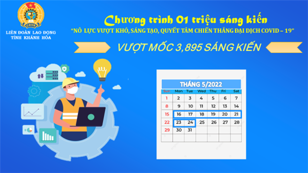 Ngay từ khi Tổng Liên đoàn Lao động (LĐLĐ) Việt Nam phát động Chương trình “1 triệu sáng kiến nỗ lực vượt khó, sáng tạo, quyết tâm chiến thắng đại dịch Covid – 19” (gọi tắt là chương trình “1 triệu sáng kiến”), LĐLĐ tỉnh đã chỉ đạo, hướng dẫn các cấp CĐ tích cực triển khai sâu rộng trong CNVCLĐ toàn hệ thống, tính đến ngày 23/5/2022, đã có 3.895 sáng kiến, đạt tỷ lệ 118% chỉ tiêu giai đoạn 1 Chương trình “1 triệu sáng kiến”. Khánh Hòa hiện đang giữ vị trí thứ 02 Cụm thi đua 10 Liên đoàn Lao động tỉnh khu vực Nam Trung bộ và Tây Nguyên và nằm trong danh sách vị trí thứ 25 đơn vị dẫn đầu cả nước về số lượng sáng kiến.