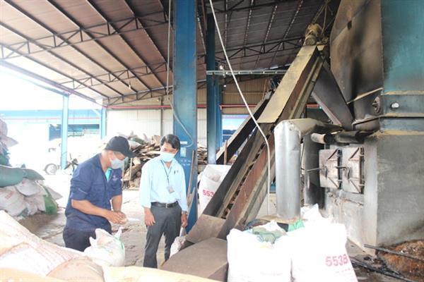 Anh Võ Quang hướng dân công nhân vận hành hệ thống cấp chất đốt tự động cho lò hơi đốt củi.