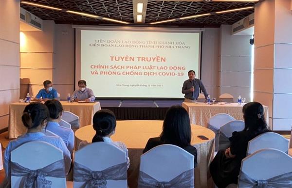 Trong khuôn khổ Tháng pháp luật năm 2021, nhằm nắm bắt kịp thời những tác động của dịch Covid-19, ngày 04/11/2021, Liên đoàn Lao động tỉnh đã phối hợp cùng LĐLĐ thành phố Nha Trang tổ chức buổi tuyên truyền pháp luật lao động và phòng chống Covid-19 trong đoàn viên, người lao động CĐCS Công ty TNHH Hải Yến.