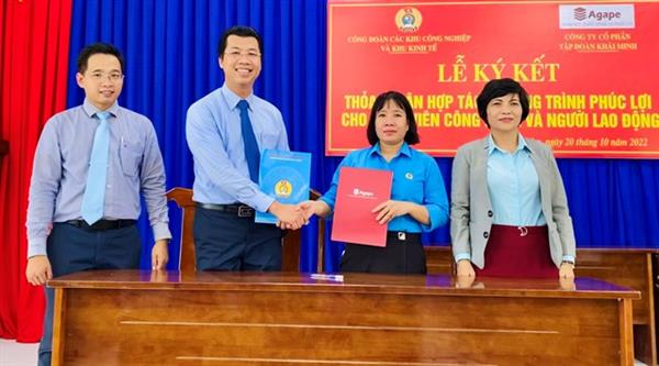 Nhằm tăng cường công tác chăm lo cho đời sống của đoàn viên và người lao động, mới đây, Công đoàn các Khu Công nghiệp và Khu Kinh tế tỉnh Khánh Hòa (Công đoàn các KCN) đã tiến hành ký kết thỏa thuận hợp tác chương trình phúc lợi Agape với Công ty Cổ phần Tập đoàn Khải Minh. Tham dự Lễ ký kết có đồng chí Trần Thị Hương - Phó Chủ tịch Liên đoàn Lao động tỉnh Khánh Hòa.