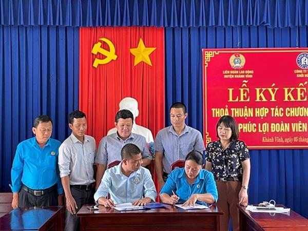 Chiều 5/8, Liên đoàn Lao động (LĐLĐ) huyện Khánh Vĩnh và Công ty TNHH Khởi Hùng tổ chức Lễ ký kết thỏa thuận hợp tác Chương trình phúc lợi dành cho đoàn viên, người lao động.