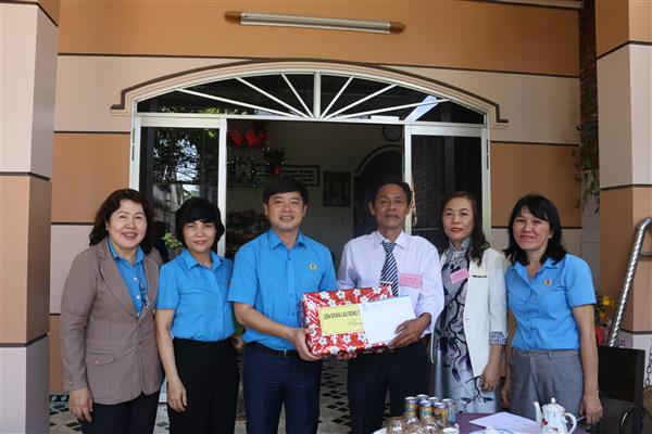 Đ/c Bùi Hoài Nam - Chủ tịch LĐLĐ tỉnh trao quà chúc mừng gia đình anh Nguyễn Long Hải, CĐCS trường Tiểu học Diên Lạc