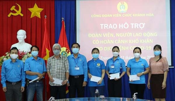 Tiếp tục hưởng ứng lời kêu gọi, phát động của công đoàn các cấp về chăm lo tốt hơn đời sống cho đoàn viên công đoàn trong đại dịch Covid-19, sáng 23/9/2021, Công đoàn Viên chức tỉnh đã thực hiện trao tặng hỗ trợ cho đoàn viên công đoàn có hoàn cảnh khó khăn bị ảnh hưởng bởi dịch bệnh Covid-19 đợt thứ II. Tham dự có đồng chí Nguyễn Thị Hằng - Phó Chủ tịch Thường trực Liên đoàn Lao động tỉnh Khánh Hòa.