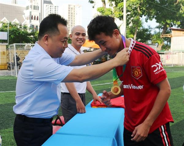 Đ/c Nguyễn Đức Trí - Phó Chủ tịch LĐLĐ tỉnh trao huy chương vàng cho cầu thủ