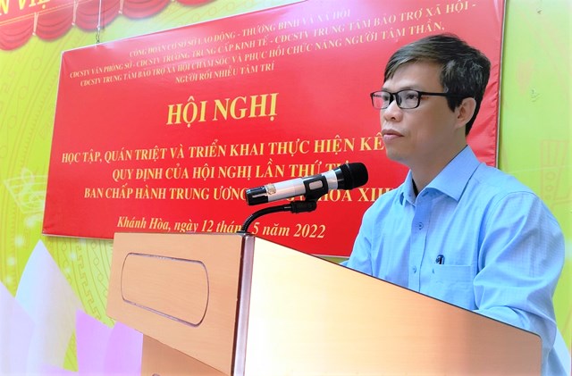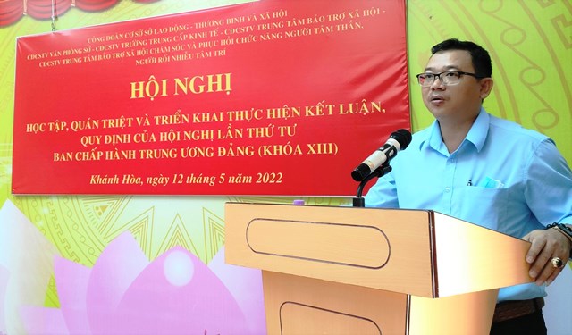 Sáng ngày 12/5/2022, tại Trường Trung cấp Kinh tế Khánh Hòa, Công đoàn các đơn vị trực thuộc Sở đã tổ chức Hội nghị học tập, quán triệt và triển khai thực hiện Kết luận, Quy định của Hội nghị lần thứ tư Ban Chấp hành Trung ương Đảng (Khóa XIII) cho công chức, viên chức và người lao động ngoài Đảng.