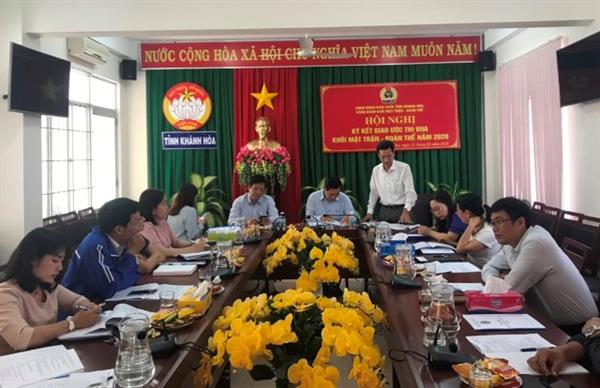 Mới đây, Công đoàn Khối Mặt trận - Đoàn thể tỉnh đã tổ chức Hội nghị ký kết giao ước thi đua năm 2020 tại Cơ quan Ủy ban MTTQVN tỉnh Khánh Hòa, đơn vị Trưởng khối. Về dự hội nghị, có đại diện lãnh đạo Công đoàn Viên chức tỉnh và BCH CĐCS các đơn vị.