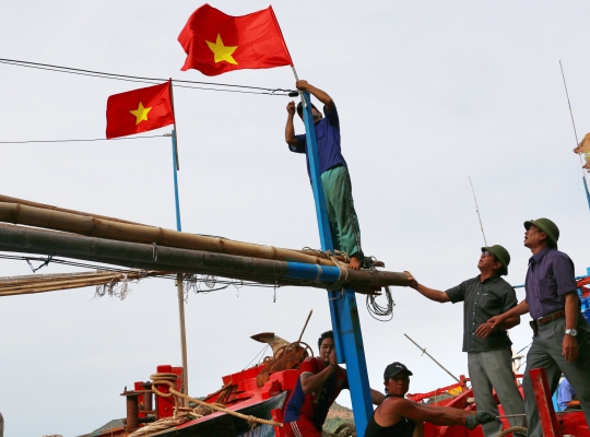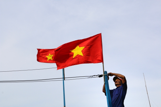 Ngư dân phấn khởi treo cờ tổ quốc trên nóc cabin tàu cá chuẩn bị ra khơi