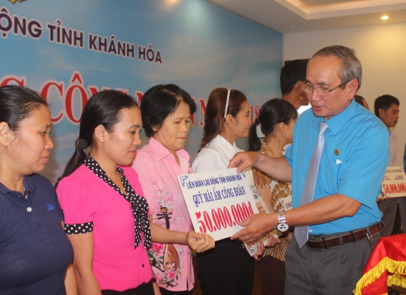 Cùng với DN chăm lo đời sống cho NLĐ, các cấp công đoàn cũng dành phần lớn hoạt động của mình hướng đến chăm lo cho công nhân. Hàng năm đã có hàng trăm những hoạt động, việc làm ý nghĩa hướng đến những công nhân, đoàn viên có hoàn cảnh khó khăn. Trong đó có thể kể đến chương trình mái ấm công đoàn là một chương trình ý nghĩa, thiết thực hơn cả. Ra đời từ năm 2007, đến nay đã vận động, tiếp nhận hơn 10 tỷ đồng để hỗ trợ, xây sửa gần 400 căn nhà cho đoàn viên, công nhân. Đươc tham gia rất nhiều đợt khảo sát, trao hỗ trợ cho công nhân xây nhà ở, mọi người đều luôn cảm thấy tự hào về những việc làm của công đoàn. Có lẽ, chúng tôi vẫn nhớ như in cái cảm giác xúc động mà chị Võ Nguyễn Thanh Huệ, (ở xã Suối Hiệp, Diên Khánh, công nhân Công ty TNHH Komega-X) được nhận hỗ trợ tiền xây nhà. Hôm đó, chị Huệ rưng rưng nước mắt vì vui mừng, hạnh phúc. Mơ ước có một ngôi nhà khang trang của chị nay đã trở thành hiện thực. Gia đình chị Huệ khá éo le, chồng bỏ đi không một lời từ biệt, để lại cho chị 2 đứa con nhỏ đang trong tuổi ăn, học. Không có người trụ cột trong gia đình, gánh nặng cơm, áo, gạo, tiền càng đè nặng lên đôi vai chị. Mái nhà cũ không ai sửa sang nên 3 mẹ con luôn phải sống chung với cảnh mưa dột, nắng nóng. Trong khi đó, với khoản lương hàng tháng hơn 3,5 triệu đồng của chị mới đủ lo cho 2 đứa con ăn học. Trước tình cảnh đó, Công đoàn Khánh Hòa” đã hỗ trợ hơn 40 triệu đồng cùng sự đóng góp của anh chị em đồng nghiệp, bà con họ hàng, lối xóm xây cho mẹ con chị căn nhà mới khang trang với diện tích 60m2. Chị Huệ nói: “Tôi rất vui mừng và hạnh phúc vì công đoàn đã hỗ trợ xây dựng cho mẹ con tôi căn nhà mới. Đây là động lực giúp tôi hoàn thành công việc và phấn đấu không ngừng trong cuộc sống”.