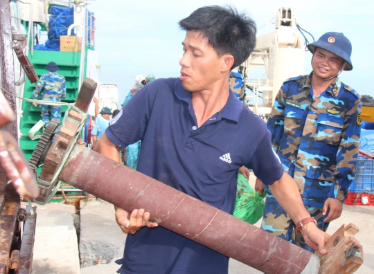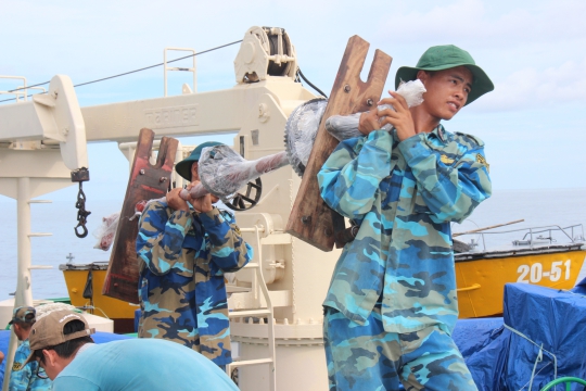 Bộ đội Trường Sa khuân vác đồ từ tàu lên đảo