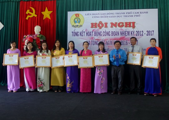 Trong nhiệm kỳ 2012-2017, Công đoàn Giáo dục thành phố Cam Ranh đã tích cực triển khai thực hiện hoạt động Công đoàn đạt hiệu quả cao: Chăm lo đời sống vật chất, tinh thần cho cán bộ, viên chức và người lao động, phối hợp với chính quyền đảm bảo chế độ chính sách cho NLĐ như chế độ lương, thưởng, BHXH, BHYT, BHTN; khen thưởng 523 lượt với số tiền hơn 143 triệu đồng, vận động CBVCLĐ đóng góp quỹ Tương tế ngành hơn 307 triệu đồng, chi các hoạt động thăm hỏi, hỗ trợ với tổng số tiền 295 triệu đồng, đóng góp Quỹ “Mái ấm Công đoàn Khánh Hòa hơn 167 triệu đồng, trong đó hỗ trợ kinh phí xây nhà “Mái ấm Công đoàn Khánh Hòa” cho 05 đoàn viên CĐ với số tiền 110 triệu đồng; Quỹ Vì Trường Sa - Hoàng Sa số tiền 698 triệu đồng; 100% đơn vị tổ chức tốt Hội nghị cán bộ viên chức, thực hiện tốt quy chế dân chủ hàng năm; phong trào thi đua “Đổi mới, sáng tạo trong dạy và học” ngày càng lan rộng trong ngành và đạt chất lượng, có 1.646/1898 đề tài đạt SKKN-NCKHSPƯD; tham gia hiến máu tình nguyện 441 đơn vị máu, vượt chỉ tiêu cấp trên giao; tổ chức nhiều hoạt động VHVN, TTTT, tham quan dã ngoại, duy trì tốt phong trào thi đua Phụ nữ “2 giỏi” trong Nữ CBVCLĐ. Tại Hội nghị, đ/c Trần Khánh Hòa - Chủ tịch LĐLĐ thành phố công bố Quyết định giải thể Công đoàn Giáo dục thành phố Cam Ranh, chỉ đạo các CĐCS khối Giáo dục trực thuộc về LĐLĐ thành phố và đề nghị các CĐCS thực hiện tốt nhiệm vụ hoạt động công đoàn, chuẩn bị tốt công tác tổ chức Đại hội CĐCS nhiệm kỳ 2012-2017.