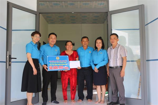 Đ/c Trần Thị Hương - Phó Chủ tịch LĐLĐ tỉnh bàn giao nhà "Mái ấm Công đoàn" cho gia đình đoàn viên Nguyễn Thị Mỹ Dung CĐCS trường THPT Lê Hồng Phong, Vạn Ninh