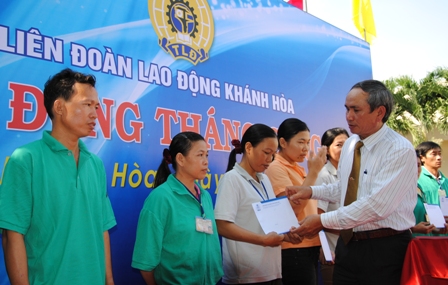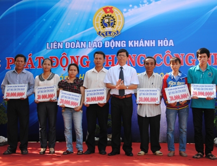 Tại buổi lễ, LĐLĐ tỉnh đã trao tặng 32 suất quà cho CNLĐ có hoàn cảnh khó khăn, bị tai nạn LĐ, mỗi suất quà 500.000 đồng; hỗ trợ kinh phí xây dựng mới 10 nhà “Mái ấm Công đoàn” và sửa chữa 01 nhà với tổng kinh phí 315 triệu đồng; Công ty CP Điện lực Khánh Hòa tặng 10 suất quà cho cho CNLĐ nghèo vượt khó.