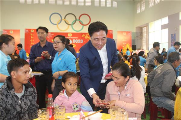 Gần trưa, hơn 250 công nhân có hoàn cảnh khó khăn, không có điều kiện về quê đón Tết được quây quần bên bữa cơm tất niên và thưởng thực những tiết mục văn nghệ ca ngợi Đảng, Bác Hồ, mùa xuân, đất nước. Thay mặt lãnh đạo tỉnh, đồng chí Nguyễn Khắc Toàn đã gửi những lời chúc Tết tốt đẹp nhất đến toàn thể anh chị em công nhân và trực tiếp đến từng bàn trao tặng những phong bao lì xì mừng năm mới trong niềm vui phấn khởi. Đặc biệt, tại đây, Liên đoàn Lao động tỉnh cũng dành tặng 250 suất quà Tết trị giá 800.000 đồng/suất cho đoàn viên, NLĐ. Chị Nguyễn Thị Kim Thủy, công nhân Công ty TNHH Sodex Sport tâm sự: “Đầu năm 2022 tôi phải nghỉ việc để chữa trị căn bệnh lao phổi. Đến đầu tháng 12-2022 khỏi bệnh, tôi mới đi làm trở lại. Trong khi chồng lại không có công việc ổn định khiến cuộc sống gia đình gặp rất nhiều khó khăn. Khi nhận được giấy mời nhận quà của công đoàn, tôi rất bất ngờ và vui mừng. Món quà mang giá trị tinh thần rất lớn, giúp gia đình đỡ một khoản mua sắm cho năm mới”.