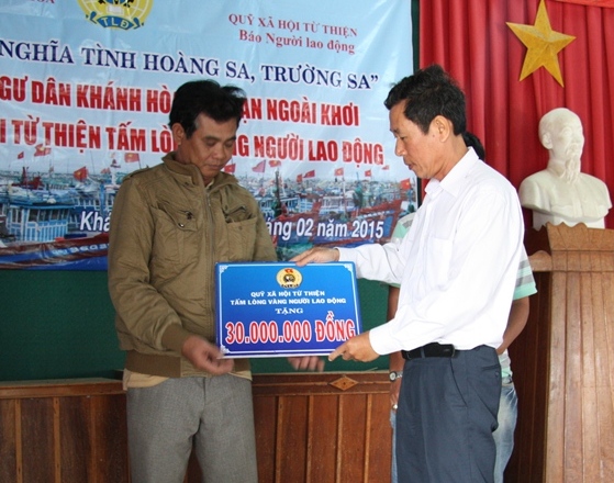Đ/c Lê Xuân Hải, Phó Chủ tịch LĐLĐ tỉnh trao kinh phí hỗ trợ cho ngư dân bị nạn ngoài khơi