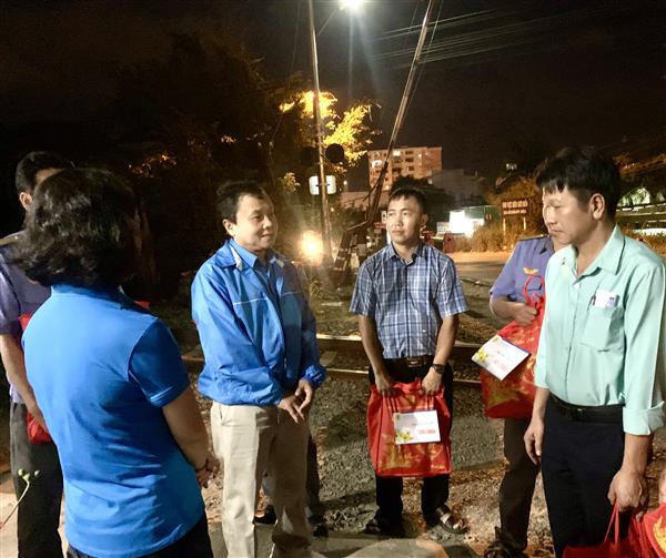 Đ/c Bùi Đăng Thành - Phó Chủ tịch Thường trực LĐLĐ tỉnh trao quà tết cho CNLĐ gác chắn Vĩnh Phương