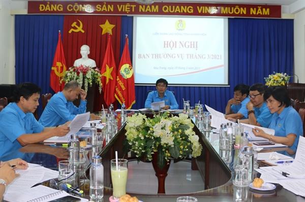 Tại Hội nghị, các đồng chí Ủy viên Ban Thường vụ đã tham gia góp ý các dự thảo: Báo cáo kết quả nửa nhiệm kỳ thực hiện Nghị quyết Đại hội X Công đoàn tỉnh Khánh Hòa và Nghị quyết Đại hội Công đoàn Việt Nam lần thứ XII; Báo cáo công tác kiểm tra, giám sát của Công đoàn các cấp nửa nhiệm kỳ 2018-2023 và phương hướng, nhiệm vụ nửa cuối nhiệm kỳ 2018-2023; Báo cáo công tác quý I, chương trình công tác trọng tâm quý II/2021 và chương trình công tác trọng tâm tháng 4/2021; Kế hoạch tổ chức hoạt động Tháng Công nhân và Tháng hành động về An toàn, vệ sinh lao động năm 2021; Kế hoạch tổ chức cuộc thi viết "Nét đẹp cán bộ, đoàn viên Công đoàn" trên mạng xã hội facebook Công đoàn Khánh Hòa; xét nâng lương thường xuyên cho CBCC cơ quan tháng 4/2021; dự kiến giao chỉ tiêu thực hiện nhiệm vụ năm 2021 cho các cấp Công đoàn; Chương trình tổ chức Hội nghị Ban Chấp hành Liên đoàn Lao động tỉnh lần thứ Tám, khóa X, nhiệm kỳ 2018-2023.