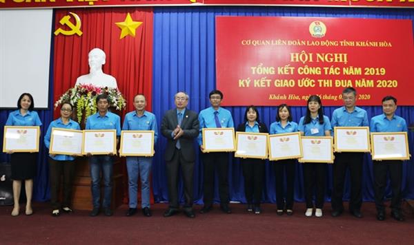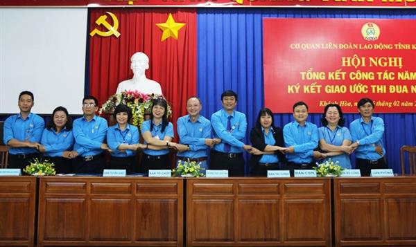 Ngày 26/02/2020, Cơ quan LĐLĐ tỉnh tổ chức Hội nghị tổng kết công tác năm 2019 và ký kết giao ước thi đua Khối các ban - đơn vị năm 2020 gồm các đơn vị: Ban Tổ chức, Ban Chính sách - Pháp luật, Ban Tuyên giáo, Ban Tài chính, Ban Nữ công, Văn phòng UBKT, Văn phòng LĐLĐ tỉnh, Nhà Văn hóa Lao động tỉnh, Nhà khách Công đoàn Khánh Hòa và BQL Khu tưởng niệm chiến sỹ Gạc Ma. Tham dự và chỉ đạo Hội nghị có đồng chí Nguyễn Thanh Phong - Chủ tịch CĐ Viên chức tỉnh cùng toàn thể cán bộ công chức cơ quan LĐLĐ tỉnh và các đơn vị trực thuộc.