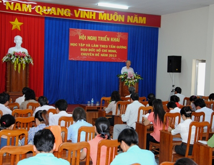 Hội nghị đã được nghe đồng chí Nguyễn Trọng Khiết – Phó Ban Tuyên giáo Tỉnh ủy quán triệt mục đích, yêu cầu trong việc tiếp tục học tập tư tưởng và tấm gương đạo đức Hồ Chí Minh, “bao gồm cả việc học tập và làm theo tác phong, phong cách của Bác, thể hiện cụ thể trong công việc thường ngày, trong quan hệ với nhân dân, đồng chí, đồng nghiệp…” gắn với thực hiện Nghị quyết Trung ương 4 khoá XI “Một số vấn đề cấp bách về xây dựng Đảng hiện nay”. Đồng chí đã tập trung phân tích sâu về phong cách quần chúng, dân chủ, nêu gương trong tư tưởng và tấm gương đạo đức Hồ Chí Minh; sự cần thiết, những vấn đề cần nắm khi học tập và làm theo tấm gương đạo đức Hồ Chí Minh và những giải pháp chủ yếu học tập và làm theo phong cách Hồ Chí Minh của người cán bộ, đảng viên.