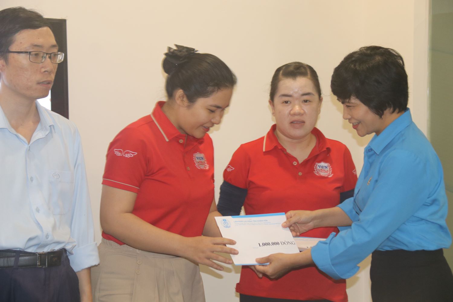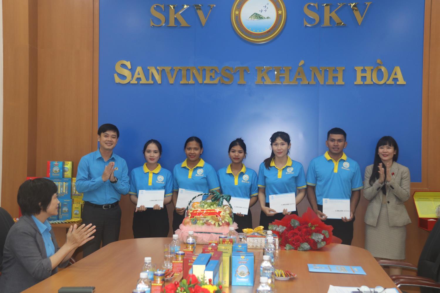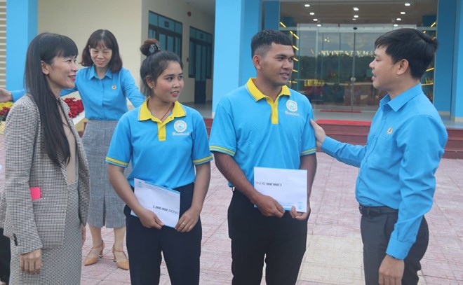 Tại buổi làm việc với DN chiều 12.12, ông Bùi Hoài Nam - Chủ tịch LĐLĐ tỉnh Khánh Hòa - trân trọng trao món quà cảm ơn lãnh đạo DN trong bối cảnh sản xuất khó khăn có những giải pháp để tăng thêm việc làm và mức thu nhập cao, nhiều chính sách chăm lo ưu việt cho NLĐ. Và trao 10 suất quà (mỗi suất 1 triệu đồng) cho đoàn viên có hoàn cảnh khó khăn.