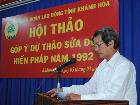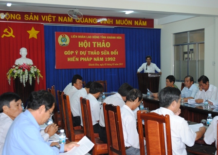 Ngày 5.3.2013, Ban Thường vụ LĐLĐ tỉnh Khánh Hòa đã tổ chức Hội thảo lấy ý kiến về Dự thảo sửa đổi Hiến pháp năm 1992 trong hệ thống tổ chức công đoàn. Dự Hội thảo có các ban LĐLĐ tỉnh; CĐ cấp ngành, huyện và tương đương; các CĐCS trực thuộc; đại diện Văn phòng thường trực Đoàn đại biểu Quốc hội tỉnh. Phó Chủ tịch Thường trực Liên đoàn Lao động tỉnh Nguyễn Văn Hài, đã chủ trì Hội thảo. Trên cơ sở hướng dẫn của Tổng LĐLĐVN và Ban Tuyên giáo Tỉnh ủy các đại biểu đã sôi nổi thảo luận và đóng góp ý kiến vào Dự thảo sửa đổi Hiến pháp năm 1992. Trong phát biểu đề dẫn, đồng chí Nguyễn Văn Hài, Phó Chủ tịch TT LĐLĐ tỉnh - đã nhấn mạnh lại 6 quan điểm cơ bản khi sửa đổi, bổ sung Hiến pháp năm 1992. Đồng thời nêu rõ trách nhiệm, phát huy quyền làm chủ, huy động trí tuệ tâm huyết của người lao động, tạo sự đồng thuận, thể hiện ý chí, nguyện vọng của người lao động và hệ thống công đoàn các cấp trong việc tham gia ý kiến sửa đổi Hiến pháp năm 1992.