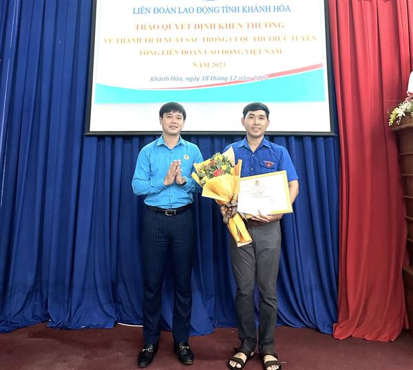 Tại buổi lễ, Liên đoàn Lao động tỉnh đã tặng bằng khen cho đoàn viên Lê Đức Bảo - đoàn viên Công đoàn cơ sở Trường THCS Bùi Thị Xuân (TP. Nha Trang) đạt giải Ba cuộc thi. Cuộc thi diễn ra từ ngày 10-10 đến 10-11 theo hình thức trực tuyến trên Tạp chí điện tử Lao động và Công đoàn. Đối tượng dự thi là đoàn viên công đoàn, công nhân, viên chức, lao động đang công tác, làm việc trong các cơ quan, đơn vị, doanh nghiệp trong cả nước. Theo thông báo Ban tổ chức Cuộc thi, Khánh Hòa, có 4.549 đoàn viên, người lao động tham gia, trong đó có 21 người trả lời đúng 100% câu hỏi của cuộc thi. Kết thúc, Ban Tổ chức đã trao 1 giải nhất (5 triệu đồng), 2 giải nhì (3 triệu đồng/giải), 3 giải ba (2 triệu đồng/giải) và 20 giải khuyến khích (1 triệu đồng/giải) cho những thí sinh xuất sắc.