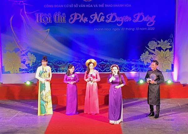 Ngày 20/10/2020, tại Nhà hát Nghệ thuật truyền thống Khánh Hòa, Công đoàn cơ sở Sở Văn hóa và Thể thao Khánh Hòa đã tổ chức Hội thi “Phụ nữ Duyên dáng” năm 2020 nhằm chào mừng thành công Đại hội đại biểu Đảng bộ tỉnh Khánh Hòa lần thứ XVIII nhiệm kỳ (2020 - 2025), kỷ niệm 90 năm ngày thành lập Hội LHPN Việt Nam. Hội thi là dịp để tuyên truyền, vận động nữ CBCCVCLĐ, đoàn viên công đoàn CĐCS thực hiện nếp sống, lối sống thanh lịch - văn minh trong mọi lĩnh vực của đời sống xã hội và tôn vinh nét đẹp tà áo dài - di sản văn hoá của Việt Nam. Tham dự có đồng chí Nguyễn Thanh Hà – Giám đốc Sở Văn hóa và Thể thao Khánh Hòa và đại diện lãnh đạo các đơn vị trực thuộc của Sở.