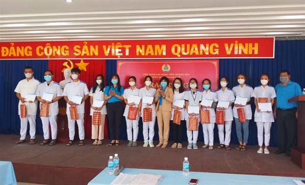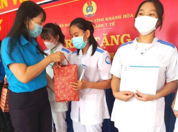 Mới đây, Liên đoàn Lao động tỉnh và Công đoàn ngành Y tế tỉnh tổ chức trao hỗ trợ cho 71 cán bộ, sinh viên Trường Cao đẳng Y tế Khánh Hòa tham gia công tác phòng chống dịch bệnh Covid-19 tại TP Hồ Chí Minh với tổng số tiền là 71 triệu đồng. Tham dự có đ/c Nguyễn Thị Hằng - Phó Chủ tịch Thường trực LĐLĐ tỉnh Khánh Hòa.