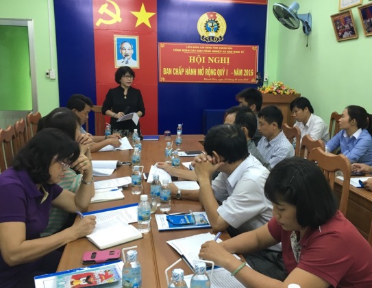 Nhằm đánh giá kết quả hoạt động Công đoàn quý I và triển khai phương hướng hoạt động trong quý II/ 2016, vừa qua, CĐ các Khu Công nghiệp và Khu Kinh tế (KCN- KKT) Khánh Hòa tổ chức Hội nghị Ban Chấp hành mở rộng quý I, đ/c Nguyễn Thị Biên - Chủ tịch CĐ các KCN-KKT chủ trì hội nghị.