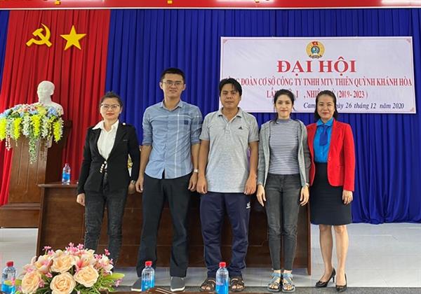 CĐCS Công ty TNHH MTV Thiên Quỳnh Khánh Hòa có 67 đoàn viên/67 lao động đạt tỷ lệ 100%, chuyên ngành nghề chế biến bột cá. Năm 2020, tình hình dịch bệnh Covid-19 ảnh hưởng các doanh nghiệp trong KCN, nhưng lãnh đạo công ty vẫn đảm bảo việc làm, tiền lương và các chế độ phúc lợi cho 100% người lao động. BCH CĐCS lâm thời đã phối hợp với doanh nghiệp thực hiện tốt công tác chăm lo cho đoàn viên, NLĐ; tổ chức tốt Hội nghị Người lao động, quan tâm công tác an toàn vệ sinh lao động tại đơn vị, thực hiện việc trích nộp kinh phí, đoàn phí công đoàn theo quy định, và hoàn thành 100% các chỉ tiêu thi đua. Năm 2020, CĐCS được xếp loại hoàn thành tốt nhiệm vụ. Tại Đại hội, CĐCS thực hiện công tác tổ chức đúng theo quy định của Điều lệ Công đoàn Việt Nam khóa XII và đã bầu được Ban Chấp hành gồm 05 đồng chí, đại diện cho ý chí, nguyện vọng của đoàn viên và người lao động.