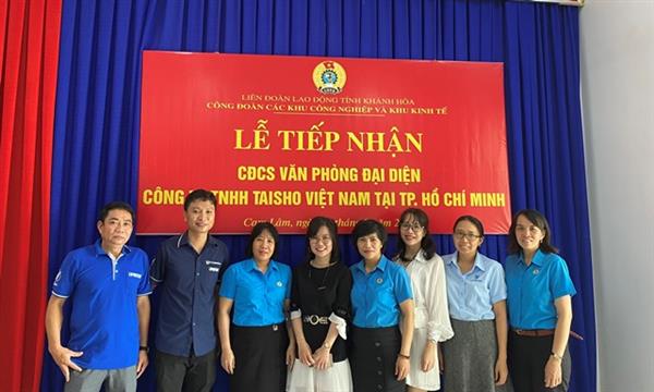 Sáng 24/9/2022, Công đoàn các KCN-KKT tỉnh Khánh Hòa (Công đoàn các KCN) tổ chức Lễ tiếp nhận Công đoàn cơ sở văn phòng đại diện Công ty TNHH Taisho Việt Nam tại thành phố Hồ Chí Minh về trực thuộc CĐCS Công ty TNHH Taisho Việt Nam tại Khánh Hòa. Tham dự có đồng chí Trần Thị Hương - Phó Chủ tịch LĐLĐ tỉnh, đồng chí Trương Thị Thu - Chủ tịch Công đoàn các KCN, đại diện công ty và đại diện Ban chấp hành CĐCS văn phòng đại diện Công ty TNHH Taisho Việt Nam tại Tp.Hồ Chí Minh và Khánh Hòa.