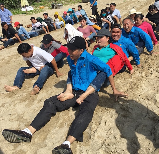 Đội 3 đang tham gia trò chơi dân gian chèo thuyền trên cạn