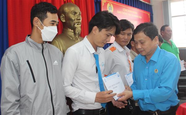 Đồng chí Bùi Đăng Thành trao hỗ trợ cho đoàn viên.