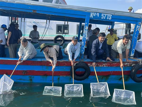 Lãnh đạo Chi cục Thủy sản Khánh Hòa thả con giống ra biển tái tạo nguồn lợi Thủy sản