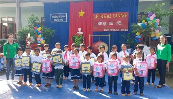 tặng quà cho các em học sinh tại trường Tiểu học Khánh Phú
