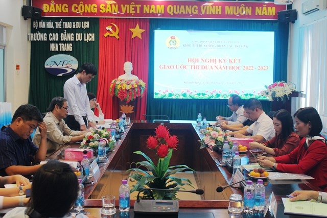 Vừa qua, tại Hội trường Trường Cao đẳng Du lịch Nha Trang đã diễn Khối thi đua các đơn vị trường học thuộc Công đoàn Viên chức tỉnh Khánh Hòa đã tổ chức ký kết giao ước thi đua năm học 2022 - 2023.