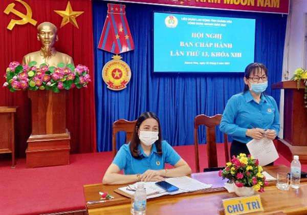 Chiều 22/9/2021 tại Sở Giáo dục và Đào tạo, Công đoàn ngành Giáo dục tổ chức Hội nghị trực tuyến Ban Chấp hành Công đoàn ngành (CĐN) lần thứ 13, khóa XIII, nhiệm kỳ 2018-2023. Tại điểm cầu Sở Giáo dục và Đào tạo tỉnh, có đồng chí Nguyễn Thị Hằng - Phó Chủ tịch Thường trực Liên đoàn Lao động tỉnh Khánh Hòa; các đồng chí Ủy viên Ban Chấp hành, Ủy viên Ủy ban kiểm tra CĐN. Các đồng chí tại 5 điểm cầu ở thành phố Cam Ranh, thị xã Ninh Hòa, huyện Cam Lâm và Vạn Ninh.
