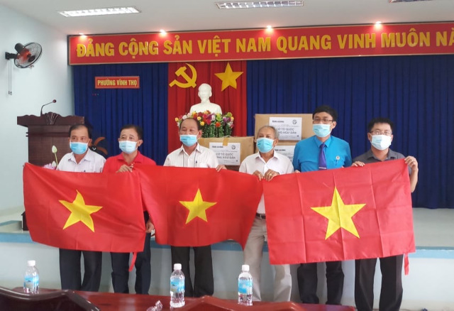 Lãnh đạo Báo NLĐ trao cờ Tổ quốc cho ngư dân Nghiệp đoàn nghề cá Vĩnh Thọ