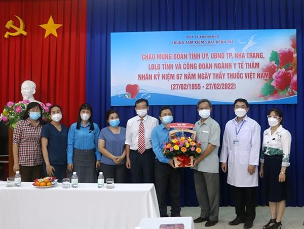 Cùng ngày, Bùi Đăng Thành – Phó Chủ tịch Liên đoàn Lao động Tỉnh Khánh Hòa đến thăm, tặng quà, chúc mừng đội ngũ y, bác sĩ Bệnh viện Lao và bệnh phổi và Bệnh viện Da Liễu, Bệnh viện Bệnh nhiệt đới, Trung tâm Kiểm soát bệnh tật tỉnh Khánh Hòa.