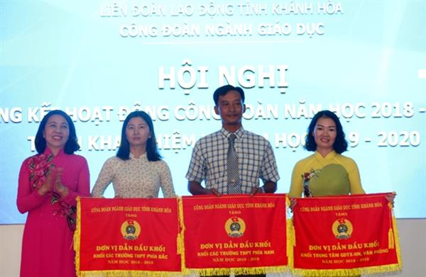 Nhân dịp này, Liên đoàn Lao động tỉnh Khánh Hòa tặng Bằng khen cho 08 tập thể, 13 cá nhân; Công đoàn Giáo dục Việt Nam tặng Bằng khen cho 01 tập thể, 04 cá nhân; Công đoàn ngành tặng Cờ thi đua xuất sắc cho 03 đơn vị dẫn đầu Khối, tặng Giấy khen cho 12 tập thể và 111 cá nhân có thành tích xuất sắc trong hoạt động công đoàn năm học 2018 - 2019.