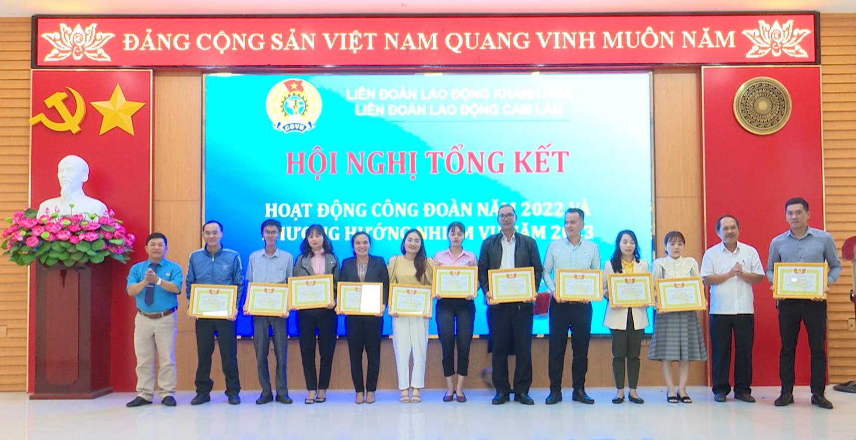 Dịp này, LĐLĐ tỉnh đã tặng bằng khen cho 7 tập thể và 10 cá nhân, LĐLĐ huyện Cam Lâm đã tặng giấy khen cho 13 tập thể và 66 cá nhân đã có thành tích xuất sắc trong phong trào thi đua và xây dựng tổ chức công đoàn vững mạnh năm 2022.