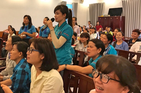 Cùng ngày, CĐ các Khu CN & KKT tỉnh phối hợp với LĐLĐ tỉnh, Bảo hiểm Xã hội và cán bộ dự án BlueStar tổ chức tư vấn các chế độ chính sách, thời giờ làm việc, chế độ thai sản đối với lao động nữ.