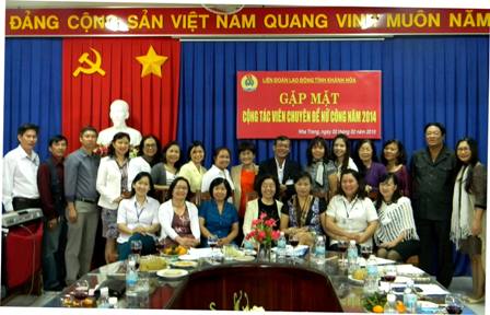 Chiều ngày 02.02, LĐLĐ tỉnh Khánh Hòa đã tổ chức gặp mặt Cộng tác viên chuyên đề nữ công xuân Ất Mùi 2015. Về dự có đ/c Phạm Xuân Danh Phó Chủ tịch Liên đoàn Lao động tỉnh, đại diện lãnh đạo các ban chuyên đề LĐLĐ tỉnh cùng 23 cộng tác viên chuyên đề nữ công.