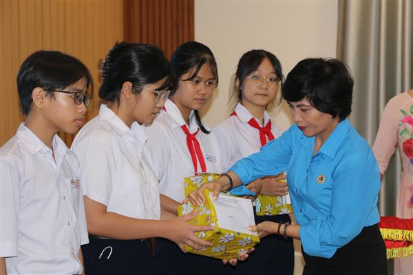 Đ/c Trần Thị Hương - Phó Chủ tịch LĐLĐ tỉnh trao học bổng cho con CNLĐ khó khăn